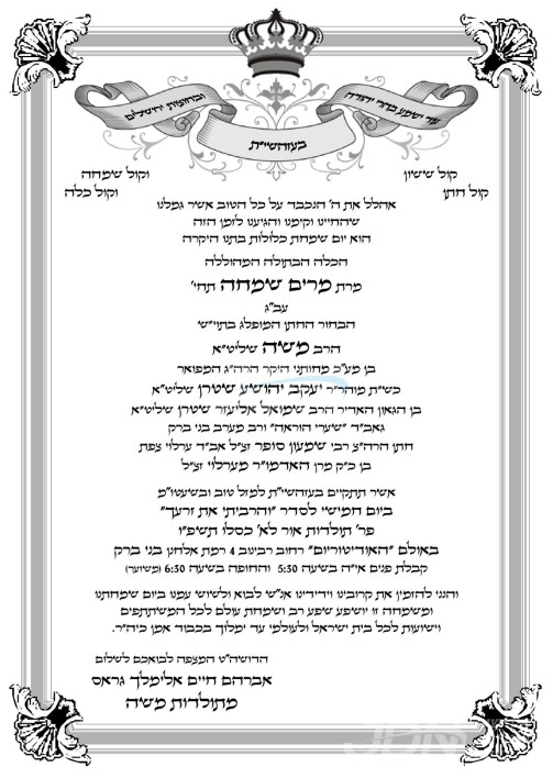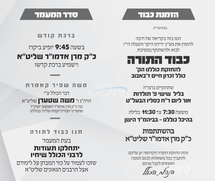 היינט קומט פאר די שמחת החתונה פונעם חתן א זון פון הגה"צ ר' יעקב יהושע שטערן שליט"א, זון פון הגה"צ ר' שמואל אליעזר שטערן שליט"א גאב"ד מערב בני ברק, און איידעם ביי הגה"צ ר' שמעון סופר זצ"ל אבד"ק תורת משה ערלוי צפת, מיט די כלה א טאכטער פון כ"ק אדמו"ר מתולדות משה שליט"א, אייניקל פון כ"ק אדמו"ר מהאלמין שליט"א. – די שמחת החתונה קומט פאר אינעם גרויסן אודיטוריום אין רמת אלחנן געגנט אין בני ברק.