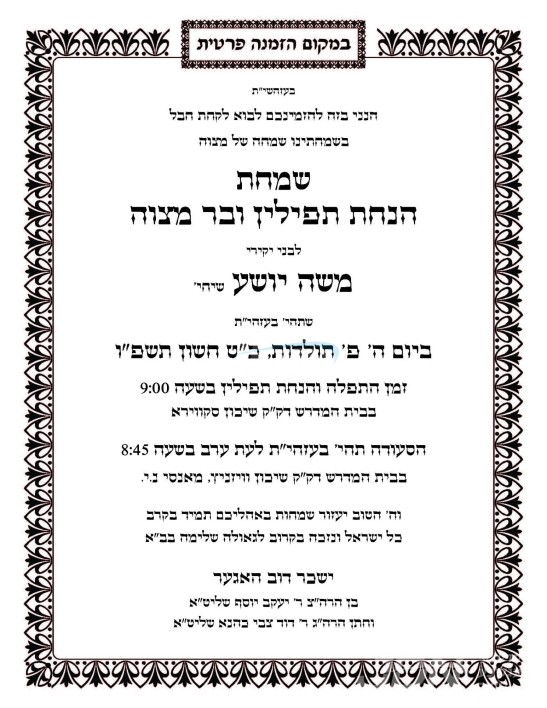 היינט קומט פאר די שמחת הבר מצוה פון א אור אייניקל ביי כ"ק אדמו"ר מסקווירא שליט"א, אייניקל פון זיין איידעם הגה"צ ר' יעקב יוסף האגער שליט"א, בנו הגדול פון כ"ק אדמו"ר מוויזניץ שליט"א פון מאנסי, א זון פון זיין זון הרב בערל האגער שליט"א, איידעם ביי הגה"צ ר' דוד צבי כהנא שליט"א, איידעם ביי הגה"צ אבד"ק ראחמיסטריווקא מאנסי שליט"א. – די מעמד הנחת תפילין קומט פאר אין ביהמ"ד הגדול אין שיכון סקווירא, נאכגעפאלגט מיטן מסיבת לחיים נאכן דאווענען אין ביהמ"ד הגדול, און די סעודת מצוה שפעטער ביינאכט אין ביהמ"ד הגדול וויזניץ אין מאנסי.