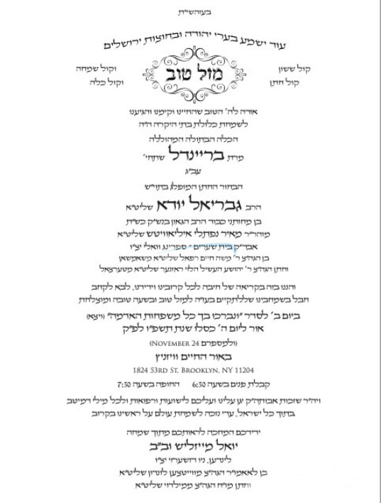 היינט קומט פאר די שמחת החתונה פונעם חתן א זון פון הגה"צ ר' מאיר נפתלי איליאוויטש שליט"א אב"ד בית שערים אין מאנסי, זון פון הגה"צ ר' משה חיים איליאוויטש שליט"א משאמשאן, און איידעם ביי הגה"צ ר' יהושע העשיל ראזנער שליט"א מטערצאל, מיט די כלה א טאכטער פון הגה"צ ר' יואל מייזליש שליט"א, זון פון הגה"צ ר' בעריש מייזליש שליט"א מווייטצען לאנדאן, און איידעם ביי הגה"צ אבד"ק מילדוי שליט"א. – די שמחת החתונה קומט פאר אין זאל אור החיים וויזניץ אין בארא פארק.