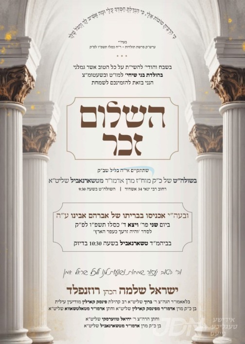 היינט קומט פאר די שמחת הברית פון א אור אייניקל ביי כ"ק אדמו"ר מטשארנאביל שליט"א, אייניקל פון זיין זון הגה"צ ר' יחיאל טווערסקי שליט"א, בן הנולד ביי זיין איידעם הרב ישראל שלמה ראזענפעלד שליט"א, זון פון הגה"צ ר' ברוך ראזענפעלד שליט"א, זון פון כ"ק אדמו"ר מפינסק קארלין שליט"א, און איידעם ביי הגה"צ ר' יהודה יחיאל שיינפעלד שליט"א אדמו"ר מטאלטשאווא. – די שמחה קומט פאר אין ביהמ"ד טשארנאביל אין אשדוד.