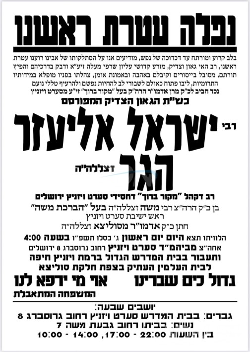 צו די פטירה פון הגה"צ אבד"ק סערט וויזניץ ירושלים זצ"ל זיצן שבעה די בני המשפחה בבית מדרשו אויף רחוב גראסבערג אין ירושלים, ביז דעם קומענדיגן ערב שבת קודש.