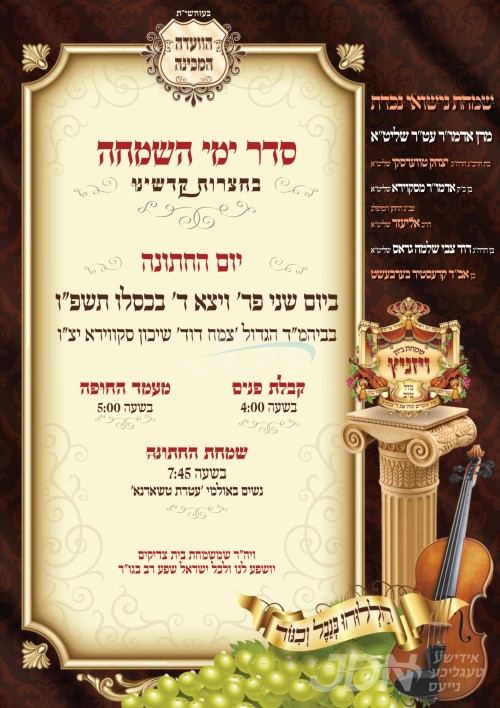 שמחת בית סקווירא – וויזניץ: היינט קומט פאר די שמחת החתונה פון די כלה יונגסטע קינד ביי הגה"צ ר' יצחק טווערסקי שליט"א, זון פון כ"ק אדמו"ר מסקווירא שליט"א, און איידעם ביי כ"ק אדמו"ר מוויזניץ שליט"א, מיט די חתן א זון פון הרב דוד גראס שליט"א ראה"כ סקווירא בני ברק, זון פון הגה"צ ר' אברהם משה גראס שליט"א אבד"ק קערעסטיר בערבעשט און דיין אין שיכון סקווירא, איידעם ביי כ"ק אדמו"ר מלעלוב זצ"ל, און איידעם ביי הגה"צ ר' שלמה גאלדמאן שליט"א, זון פון הגה"צ ר' שמואל גאלדמאן שליט"א מזוועהיל פון שיכון סקווירא. – די שמחת החתונה קומט פאר אין ביהמ"ד הגדול אין שיכון סקווירא.