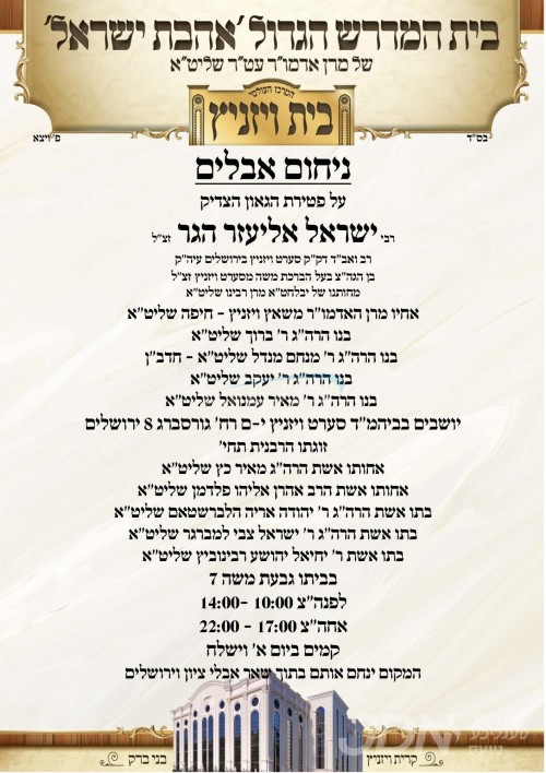 צו די פטירה פון הגה"צ אבד"ק סערט וויזניץ ירושלים זצ"ל זיצן שבעה די בני המשפחה, די קינדער הרבנים שליט"א און זיין ברודער כ"ק אדמו"ר משאץ וויזניץ שליט"א, אין ביהמ"ד סערט וויזניץ אויף רחוב גראסבערג אין ירושלים.