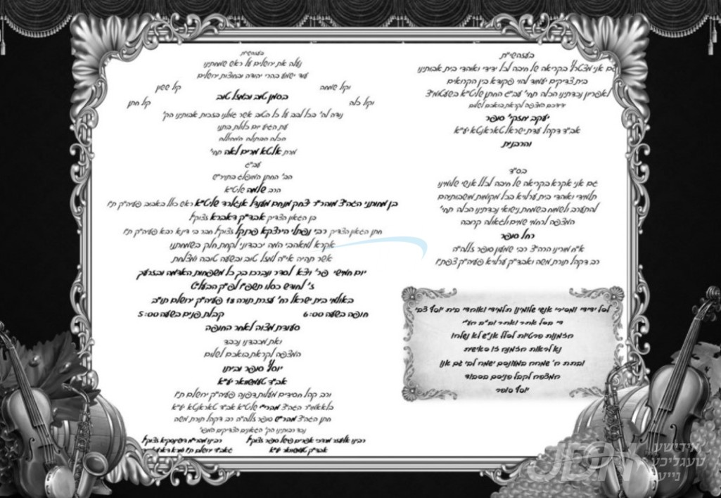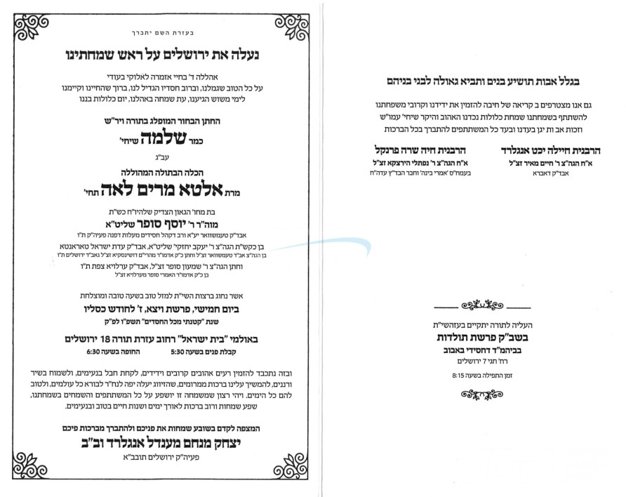 היינט קומט פאר די שמחת החתונה פונעם חתן א זון פון הגה"צ ר' יצחק מענדיל ענגלארד שליט"א ראה"כ באבוב ירושלים, זון פון הגה"צ אב"ד דאברא זצ"ל, און איידעם ביי הגה"צ ר' נפתלי הירצקא פרענקל זצ"ל חבר ביד"ץ העדה החרדית, מיט די כלה א טאכטער פון הגה"צ ר' יוסף סופר שליט"א אב"ד טעמעשוואר ירושלים, זון פון הגה"צ ר' יעקב יחזקי' סופר שליט"א גאב"ד טאראנטא, און איידעם ביי הגה"צ אבד"ק ערלוי צפת זצ"ל. – די שמחת החתונה קומט פאר אין זאל בית ישראל אין ירושלים.