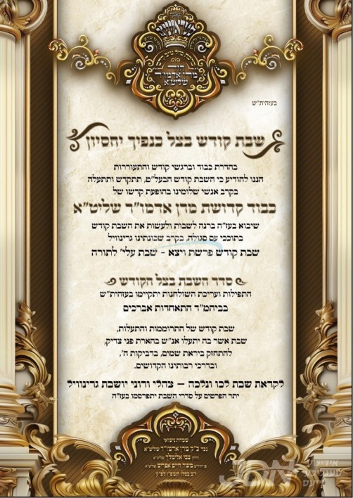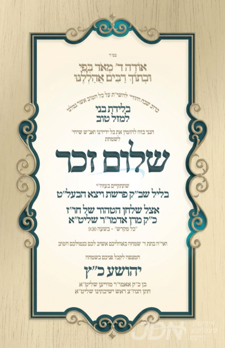 דעם שבת קומט פאר די שמחת השלום זכר פון א אור אייניקל ביי כ"ק אדמו"ר ממונקאטש שליט"א, אייניקל פון בנו הגדול הגה"צ ראש ישיבת מונקאטש שליט"א, בן הנולד ביי זיין זון הגה"צ ר' יהושע כ"ץ שליט"א, זון פון כ"ק אדמו"ר מוויען שליט"א. – די שמחה קומט פאר אין ביהמ"ד מונקאטש אין בארא פארק.