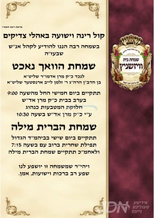 היינט קומט פאר די שמחת הברית פון א אייניקל ביי כ"ק אדמו"ר מוויזניץ שליט"א פון בית שמש, איידעם ביי כ"ק אדמו"ר מוויזניץ שליט"א לרפו"ש, בן הנולד ביי זיין איידעם הרב שלמה יהודה זלמן לייב ארנסטר שליט"א, זון פון הגה"צ ר' אליעזר ארנסטר שליט"א אבד"ק מאור חיים צפת. – די שמחה קומט פאר אין ביהמ"ד הגדול וויזניץ אין בית שמש.