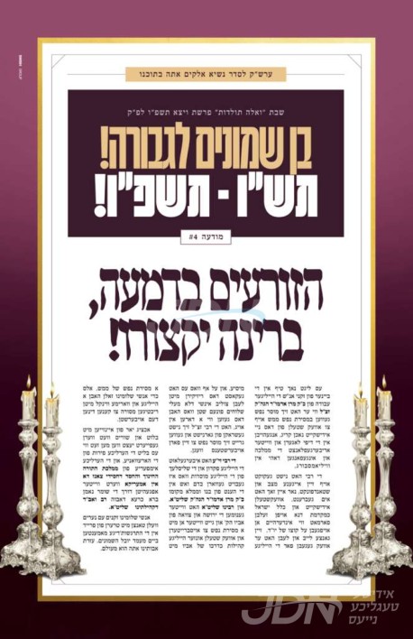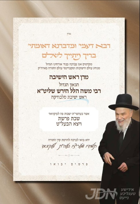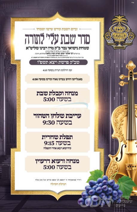 שמחת בית סאטמאר: דעם שבת קומט פאר די שמחת האויפרוף פון א אייניקל ביי כ"ק אדמו"ר מסאטמאר שליט"א, די חתן א זון פון זיין איידעם הגה"צ ר' אלטר יעקב יצחק גלאנץ שליט"א, זון פון הגה"צ אבד"ק סאדילקוב שליט"א, מיט די כלה א טאכטער פון הגה"צ ר' יוסף מייזליש שליט"א מח"ס עבודת הצדיקים, זון פון הגה"צ ר' בעריש מייזליש שליט"א מווייטצען לאנדאן, און איידעם ביי כ"ק אדמו"ר מאלעסק זצ"ל. – די שמחת האויפרוף קומט פאר אין ביהמ"ד הגדול סאטמאר אין וויליאמסבורג. – אזוי אויך קומט פאר די שמחת השלום זכר פון א אייניקל ביי כ"ק אדמו"ר מסאטמאר שליט"א, בן הנולד ביי זיין יונגסטן איידעם הגה"צ ר' אלחנן חיים פילאפף שליט"א, זון פון הגה"צ אבד"ק מכלל יופי שליט"א חבר הביד"ץ דקהל יטב לב ד'סאטמאר.