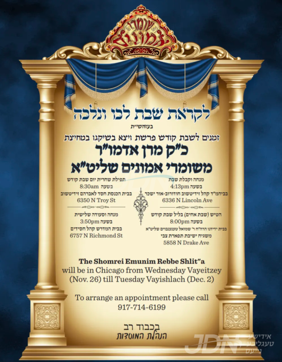 כ"ק אדמו"ר משומרי אמונים שליט"א איז צוגאסט אויף שבת אין שיקאגא לטובת מוסדותיו הקדושים.