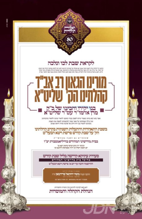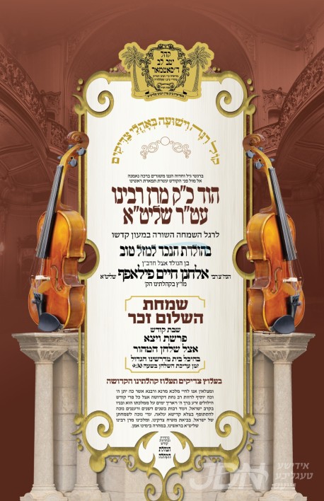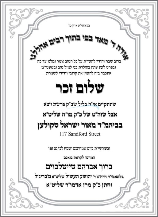 דעם שבת קומט פאר די שמחת השלום זכר פון א אייניקל ביי כ"ק אדמו"ר מסקולען שליט"א פון וויליאמסבורג, בן הנולד ביי זיין איידעם הרב ברוך אברהם טייטלבוים שליט"א, זון פון הגה"צ ר' יהושע העשיל טייטלבוים שליט"א מבריגל. - די שמחה קומט פאר אין ביהמ"ד מאור ישראל סקולען אין וויליאמסבורג.