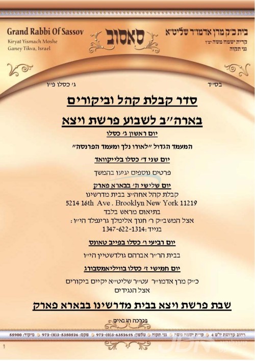 כ"ק אדמו"ר מסאסוב שליט"א איז צוגאסט אויף דעם שבת אין בארא פארק בקרב חסידיו, די תפילות און טישן קומען פאר בבית מדרשו.