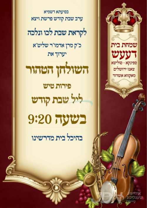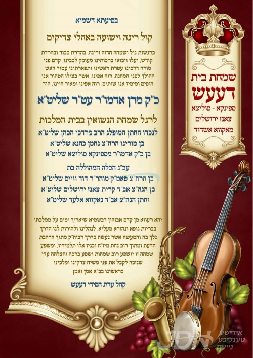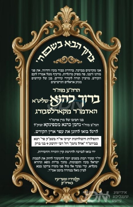 שמחת בית דעעש – ספינקא סוליצא: דעם שבת קומט פאר די שמחת האויפרוף פון א אייניקל ביי כ"ק אדמו"ר מדעעש שליט"א, די חתן א זון פון זיין איידעם הגה"צ ר' נחמן כהנא שליט"א, זון פון כ"ק אדמו"ר מספינקא סוליצא שליט"א, מיט די כלה א טאכטער פון הגה"צ ר' דוד ווייס שליט"א, זון פון הגה"צ גאב"ד קרית צאנז ירושלים שליט"א, און איידעם ביי הגה"צ אבד"ק מאקאווא אשדוד שליט"א. – די שמחת האויפרוף קומט פאר אין ביהמ"ד דעעש אין בני ברק..