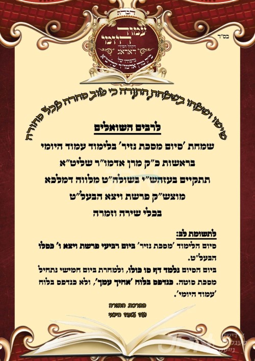 היינט קומט פאר די מעמד סיום מסכת נזיר במסגרת הלימוד עמוד היומי דחסידי דאראג, עס קומט פאר אין ביהמ"ד הגדול דאראג אין בני ברק, אין שפיץ פון כ"ק אדמו"ר מדאראג שליט"א.