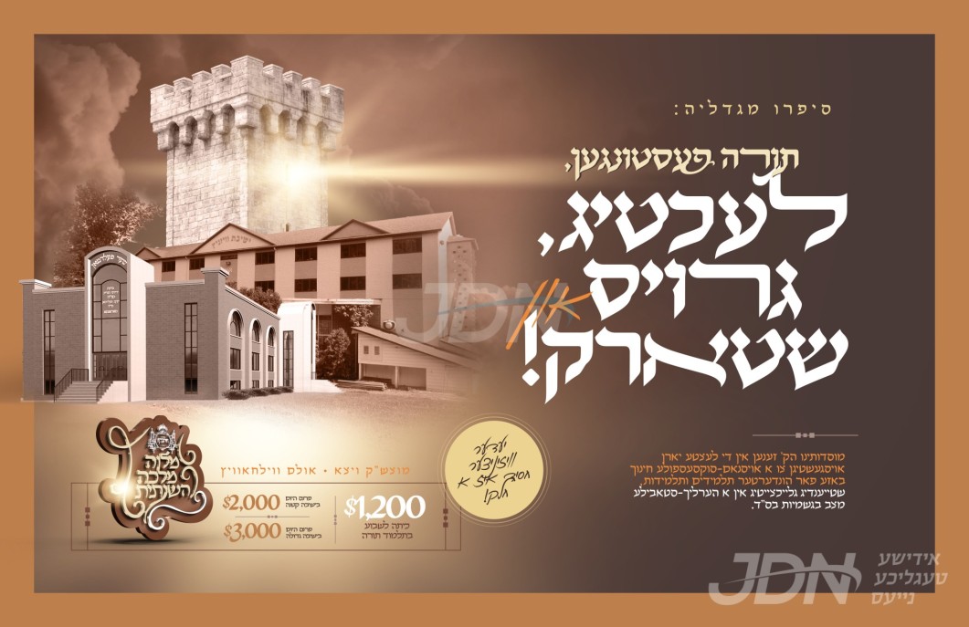היינט קומט פאר די יערליכע מלוה מלכה "א גוטן טאג" לטובת תלמוד תורה בית יודא אין קרית טאהש, אין זאל בית צירל, אין שפיץ פון כ"ק אדמו"ר מטאהש שליט"א.