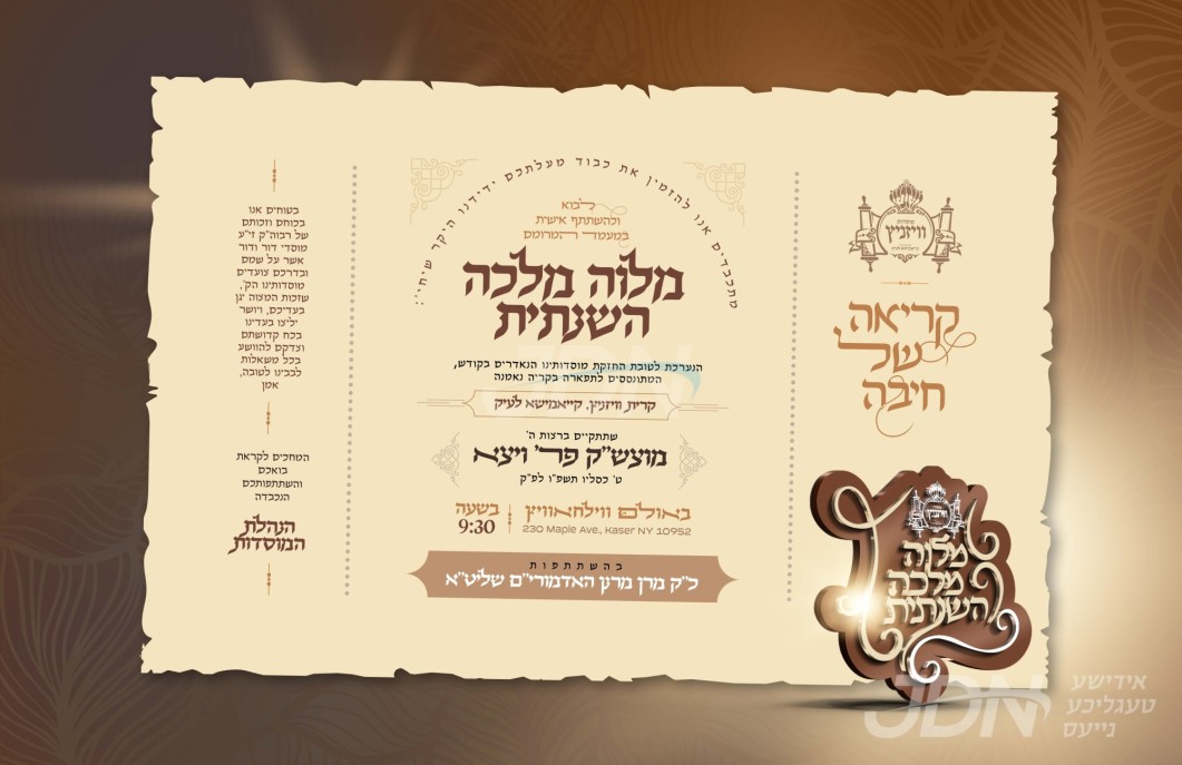 היינט קומט פאר די יערליכע מלוה מלכה "מסורת אבות" לטובת מוסדות וויזניץ אין בארא פארק, מוקדש לעילוי נשמתו פונעם לאנגיעריגער מנהל המוסדות הרב החסיד ר' מאיר טויב ז"ל, עס קומט פאר אין זאל פון אור החיים וויזניץ בבנין הת"ת, אין שפיץ פון כ"ק אדמו"ר מוויזניץ שליט"א פון בארא פארק.