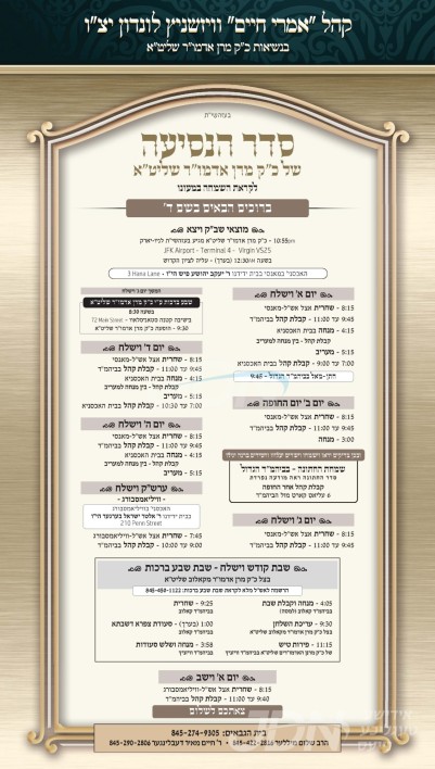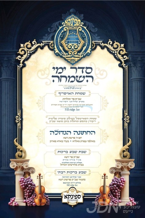 שמחת בית ספינקא: היינט קומט פאר די שמחת השבע ברכות פון א אייניקל ביי כ"ק אדמו"ר מספינקא שליט"א, די חתן עלטסטע זון פון זיין זון הגה"צ אבד"ק ספינקא לעיקוואד שליט"א, איידעם ביי הגה"צ אבד"ק בערטש שליט"א, מיט די כלה א טאכטער פון הגה"צ ר' חיים ארי' שפיטץ שליט"א ראש ישיבת עץ חיים ווילרייק, איידעם ביי הגה"צ ר' חיים יוסף דוד ווייס שליט"א דומ"ץ סאטמאר אנטווערפן. – די שמחת השבע ברכות קומט פאר אין זאל פון רידזש טערעס אין לעיקוואד צוגעשטעלט דורך די ספינקא קהילה.
