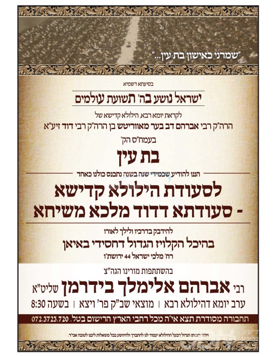 לקראת די יומא דהילולא קדישא פונעם הייליגן בת עין זי"ע וואס געפאלט דעם קומענדיגן דינסטאג י"ב כסלו, וועט הגה"צ המשפיע ר' אלימלך בידערמאן שליט"א אפרעכטן היינט די גרויסארטיגע יארצייט סעודה אין ביהמ"ד הגדול באיאן אין ירושלים.