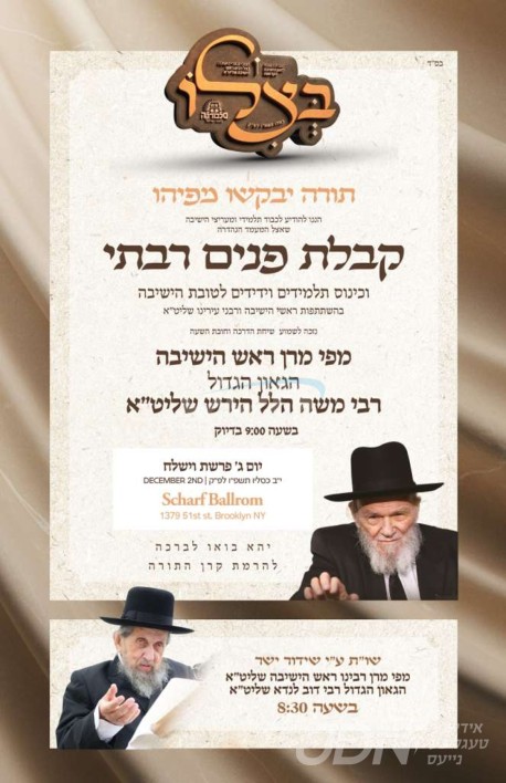 היינט נאכט וועט געפראוועט ווערן א גרויסע מעמד קבלת פנים לכבודו אין הארץ פונעם עיר ואם בישראל בארא פארק, אין די נייע פראכטפולע זאל "אולם דוד שארף", וואו עס איז ערווארטעט א ריזן ציבור פון נאנט און ווייט ארויסצוצייגן דעם כבוד התורה מיט אירע שענסטע קאלירן, דער ראש ישיבה וועט משמיע זיין דברי ברכה לכל העם הנאספים, און א ספעציעלע שמועס וועט מען הערן דורך א לייוו הוקאפ, פון ידידו ורעו הגאון הגדול רבי דוב לאנדא שליט"א ראש ישיבת סלאבאדקע, ממעון תורתו אינעם עיר התורה בני ברק.