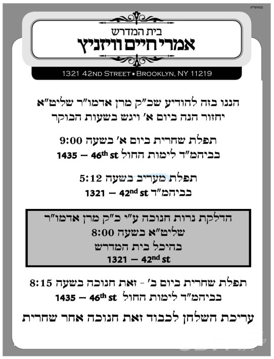 כ"ק אדמו"ר מוויזניץ שליט"א פון ירושלים וועלכער האט זיך אויפגעהאלטן דורכאויס די ימי החנוכה בקרב חסידיו אין ארץ ישראל, קערט זיך היינט צוריק למעון קדשו אין בארא פארק, און וועט אפרעכטן די מעמד הדלקת נרות חנוכה היינט אויפדערנאכט בבית מדרשו קהל אמרי חיים וויזניץ אויף די צוויי און פערציגסטע סטריט.