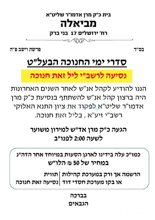 כ"ק אדמו"ר מביאלא בני ברק שליט"א וועט היינט אויפדערנאכט נאכן ליכט צינדן ארויספארן קיין אתרא קדישא מירון, אויף א תפילת רבים בראש קהל חסידיו.