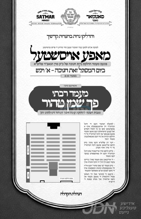היינט קומט פאר די מעמד פך שמן טהור בחצר הקודש סאטמאר מאנסי, לטובת קופת חינוך הטהור פאר די מוסדות הקדושים על טהרת הקודש, אין ביהמ"ד הגדול ויואל משה ד'סאטמאר ביים מעמד הדלקת נרות חנוכה דורך כ"ק גאב"ד סאטמאר מאנסי שליט"א.