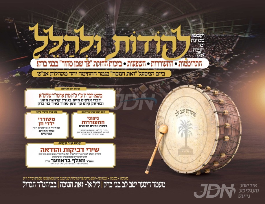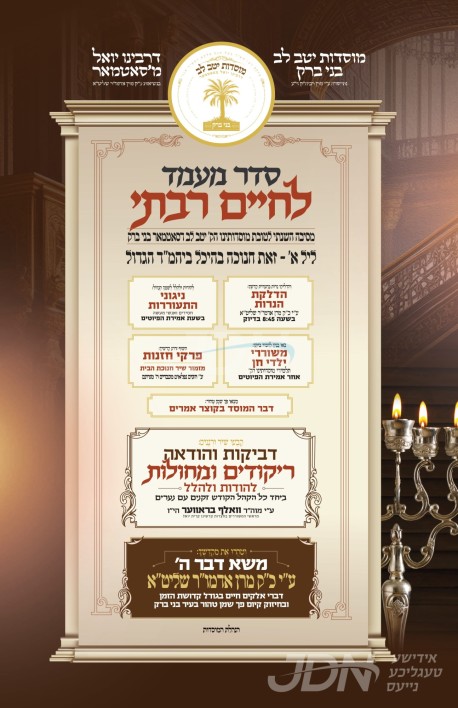 היינט קומט פאר די יערליכע מגבית לטובת מוסדות יטב לב ד'סאטמאר אין בני ברק, ביים מעמד הדלקת הנרות ליל זאת חנוכה דורך כ"ק אדמו"ר מסאטמאר שליט"א, אין ביהמ"ד הגדול דקהל יטב לב ד'סאטמאר אין וויליאמסבורג.