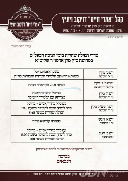 כ"ק אדמו"ר מקאשוי שליט"א וועט היינט אפרעכטן די מעמד הדלקת נרות חנוכה אין מאנסי, אין ביהמ"ד התאחדות אברכים ברכת שמים קאשוי אויף סוזען.