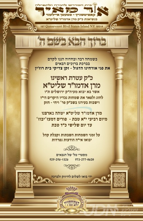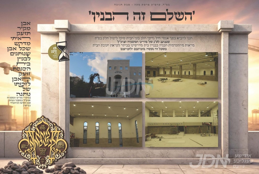 היינט קומט פאר די מעמד חנוכת הבית פאר די נייע ביהמ"ד דקהל אמונת ישראל אויף רחוב חב"ד אין ביתר עילית, אין שפיץ פון הגה"צ רבי שמואל יהודה זילבער שליט"א אבד"ק אמונת ישראל וועלכער קומט היינט אן צוגאסט קיין ארץ ישראל צו באשיינען די מעמד.