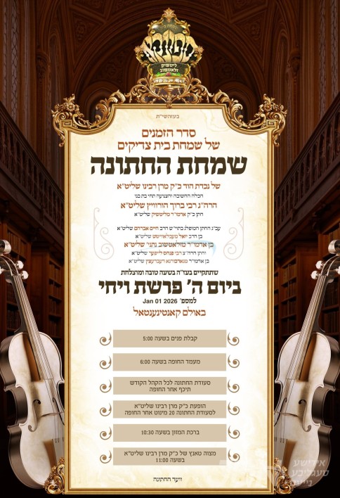שמחת בית ספינקא: היינט קומט פאר די שמחת החתונה פון א אייניקל ביי כ"ק אדמו"ר מבית יצחק ספינקא שליט"א, די כלה א טאכטער פון זיין זון הגה"צ ר' ברוך הורוויץ שליט"א, איידעם ביי כ"ק אדמו"ר מליטשיק שליט"א, מיט די חתן א זון פון הגה"צ ר' יואל מיכלאוויטש שליט"א, זון פון כ"ק אדמו"ר מזלאטשוב נתני' שליט"א. – די שמחת החתונה קומט פאר אין קאנטינענטאל זאל אין וויליאמסבורג.