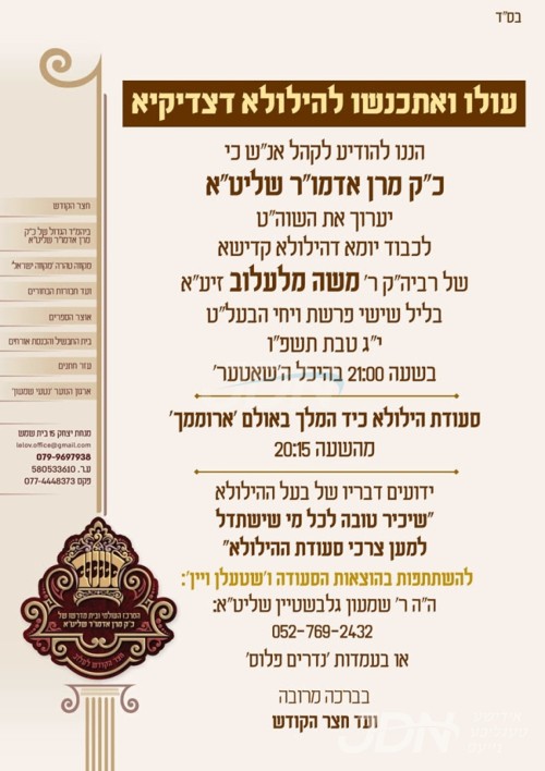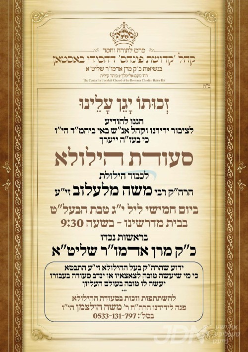 היינט נאכט י"ג טבת געפאלט די יומא דהילולא קדישא פון הרה"ק רבי משה מלעלוב זי"ע, די אייניקלעך כ"ק האדמורי"ם מלעלוב שליט"א וועלן אפרעכטן די יארצייט טישן ברוב עם.