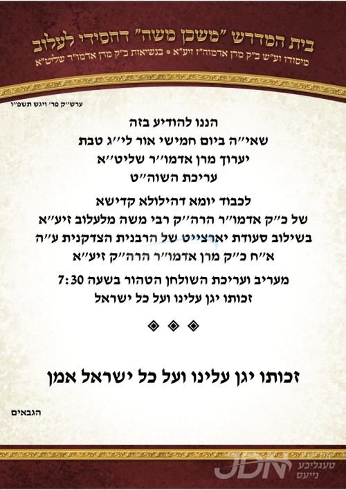 כ"ק אדמו"ר מלוצק שליט"א קומט היינט אן צוגאסט קיין מאנטריאל בקרב חסידיו, דער רבי וועט האבן די אכסניא אין שטוב פון הנגיד החסיד ר' שמואל פישמאן הי"ו אין לויף פון די קומענדיגע וואך.