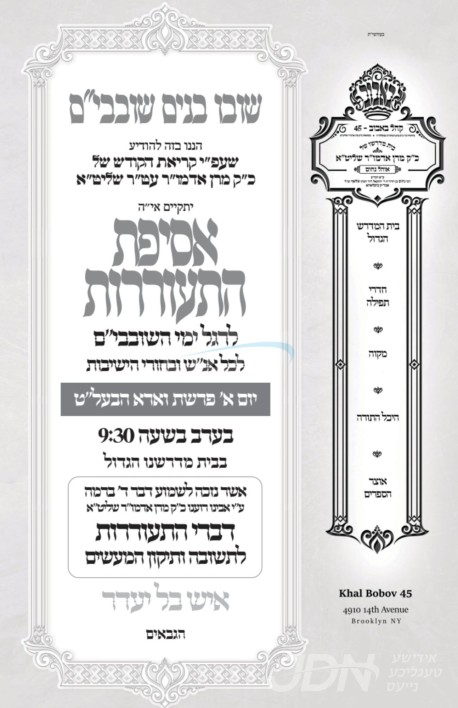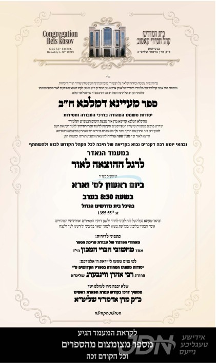 היינט קומט פאר די שמחת הברית לבן הנולד ביי הרב ישראל ראטטענבערג שליט"א, זון פון הגה"צ ר' פינחס שלום ראטטענבערג שליט"א אבד"ק שירת הלויים קאסאן מאנסי, זון פון כ"ק אדמו"ר מקאסאני שליט"א, און איידעם ביי הגה"צ ר' יהושע פיש שליט"א, זון פון כ"ק אדמו"ר מביקסאד שליט"א, און איידעם ביי כ"ק אדמו"ר מוויזניץ שליט"א פון קייאמישע. – די שמחה קומט פאר אין ביהמ"ד שירת הלויים קאסאן אין מאנסי.
