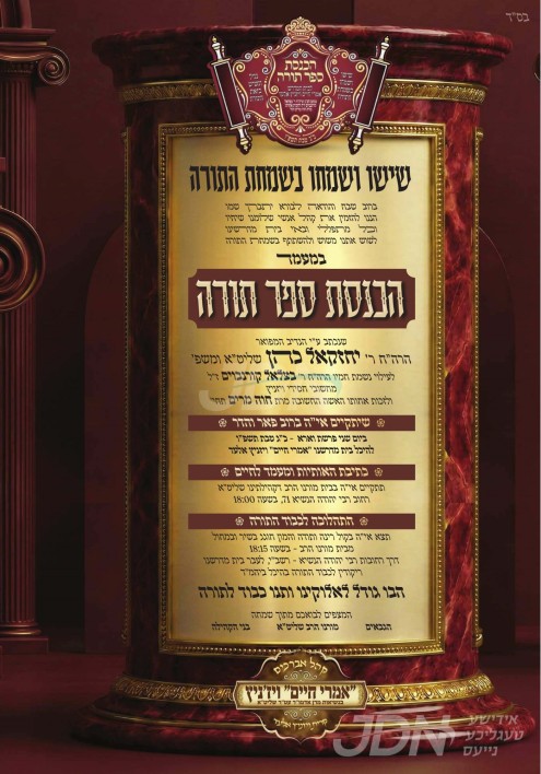 היינט קומט פאר די מעמד הכנסת ספר תורה וואס ווערט אריינגעגעבן צום ביהמ"ד אמרי חיים וויזניץ אין אלעד, נדבת הרב החסיד ר' יחזקאל כהן הי"ו, לע"נ הרב החסיד ר' בצלאל קורנבוים ע"ה.
