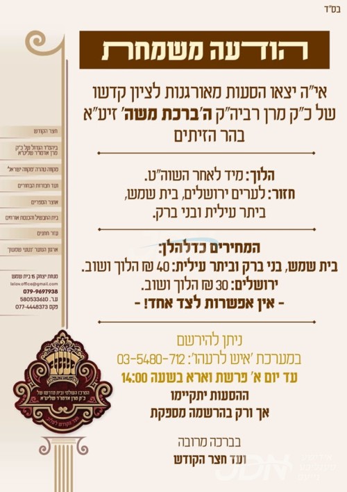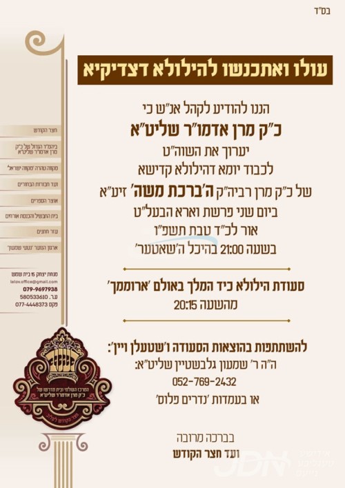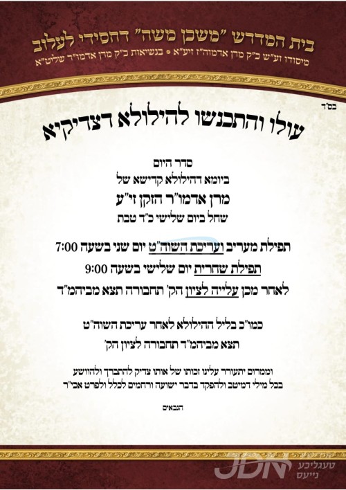 היינט נאכט כ"ד טבת געפאלט די יומא דהילולא קדישא פון כ"ק אדמו"ר הרה"ק רבי משה מרדכי מלעלוב זצ"ל בעל ברכת משה, די קינדער כ"ק האדמורי"ם מלעלוב ניקלשבורג, מהרי"ד מלעלוב, און לעלוב עזרת תורה, און די אייניקלעך כ"ק האדמורי"ם מלעלוב שליט"א וועלן אפרעכטן די יארצייט טישן ברוב עם, און פוקד זיין דעם ציון הק' אויפן הר הזיתים להיפקד בדבר ישועה ורחמים.