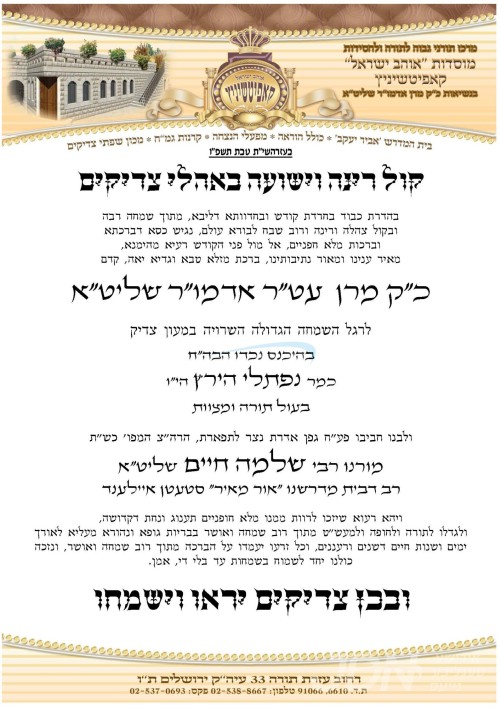 שמחת בית סטריקוב – זוועהיל: עס איז געשלאסן געווארן די שידוך פונעם חתן א זון פון הגה"צ ר' יעקב יוסף הירשלער שליט"א, זון פון הגה"צ ר' שמעון הירשלער זצ"ל פון לאנדאן, און איידעם ביי כ"ק אדמו"ר מלויעוו טשערנאביל פארשעי שליט"א, מיט די כלה א טאכטער פון הגה"צ ר' שלמה גאלדמאן שליט"א ראש ישיבת תורת שלמה זוועהיל, זון פון כ"ק אדמו"ר מזוועהיל ירושלים שליט"א, און איידעם ביי כ"ק אדמו"ר מסטריקוב שליט"א.