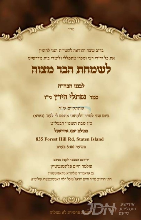 היינט קומט פאר די שמחת הבר מצוה פון א אייניקל ביי כ"ק אדמו"ר מקאפיטשניץ שליט"א, א זון פון זיין זון הגה"צ ר' שלמה חיים פלינטנשטיין שליט"א רב ביהמ"ד אור מאיר קאפיטשניץ אין סטעטן איילענד, איידעם ביי הגה"צ ר' חיים יחיאל מיכל ראטטענבערג שליט"א מקאסאני. – די שמחה קומט פאר אין זאל פון יאנג איזריעל אין סטעטן איילענד.
