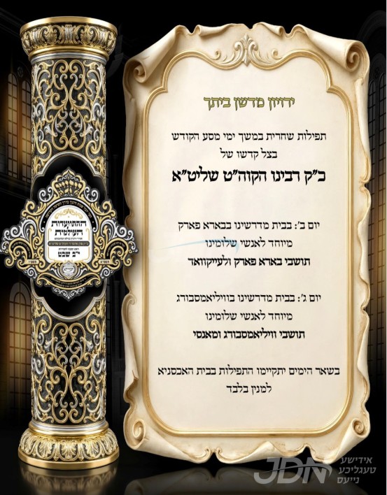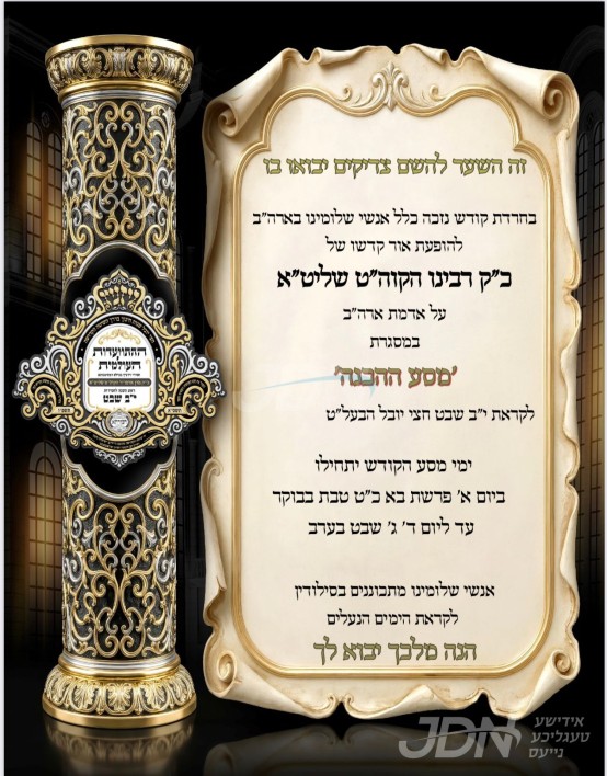 היינט קומט פאר די מלוה מלכה "חמשת אלפים" לטובת מוסדות באבוב אין לאנדאן, און די הרחבת גבולי בניני הקהילה, אין שפיץ פון הגה"צ ר' חיים שלום האלבערשטאם שליט"א בנו הגדול פון כ"ק אדמו"ר מבאבוב שליט"א.