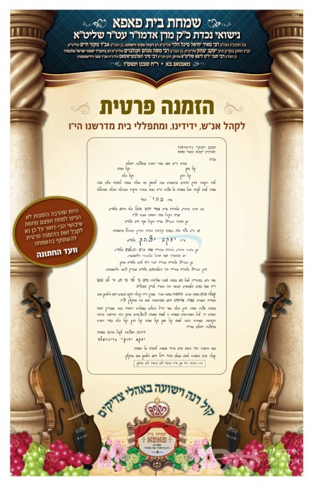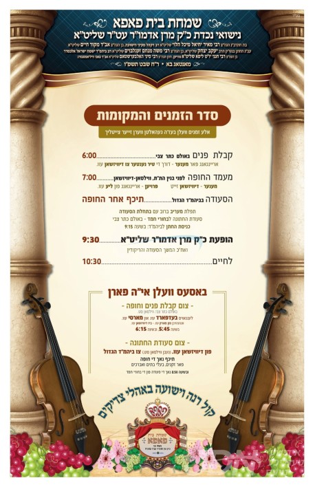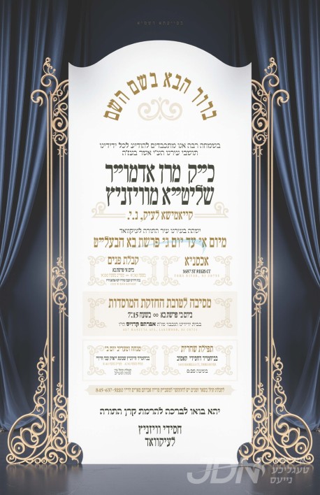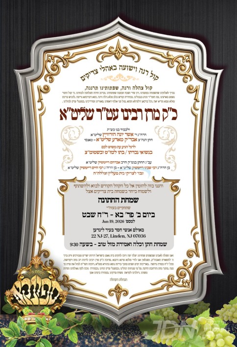 היינט קומט פאר די שמחת החתונה פונעם חתן א זון פון הרב נחמן זילבער שליט"א, זון פון הגה"צ גאב"ד פריימאן שליט"א ראב"ד התאחדות הרבנים, און איידעם ביי כ"ק אדמו"ר מרודניק שליט"א, מיט די כלה א טאכטער פון הרב חיים שיק שליט"א, זון פון הגה"צ אבד"ק טאקאי זצ"ל, און איידעם ביי כ"ק אדמו"ר מנדבורנא ב"פ שליט"א. – די שמחת החתונה קומט פאר אין זאל אור החיים וויזניץ אין בארא פארק.