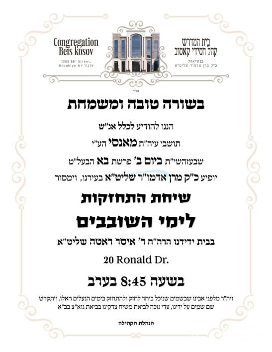 כ"ק אדמו"ר מקאסוב שליט"א וועט היינט אנקומען קיין מאנסי, און אויפטרעטן מיט א שמועס פאר קהל חסידיו לרגל די ימי השובבי"ם, אין שטוב פון הנגיד החסיד ר' איסר ראטה הי"ו.
