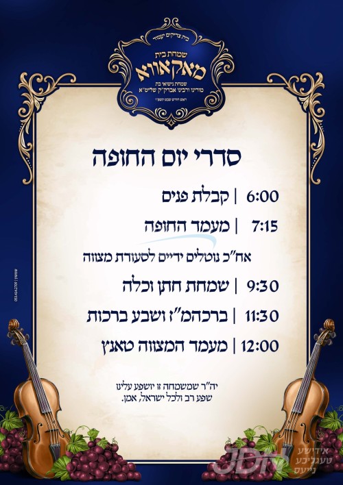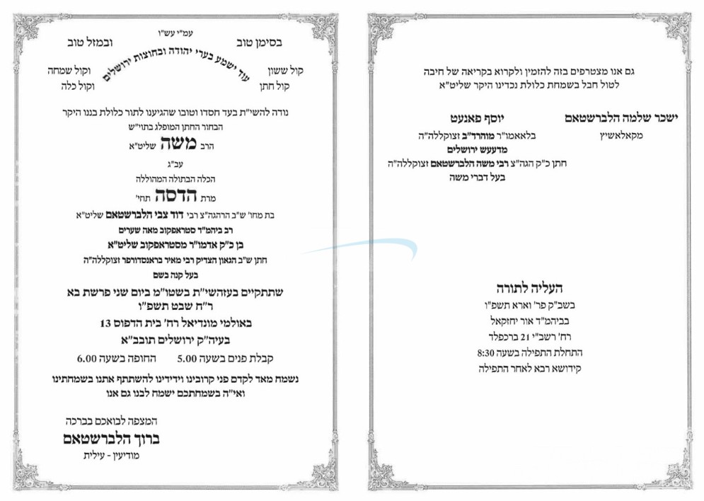 היינט קומט פאר די שמחת החתונה פונעם חתן א זון פון הגה"צ ר' יעקב זעהוואלד שליט"א אבד"ק אלטשטאט, איידעם ביי הגה"צ ר' הערשל וואגשאהל שליט"א משפיע אין חצה"ק ערלוי, מיט די כלה א טאכטער פון הגה"צ ר' ישראל יעקב לעמבערגער שליט"א אבד"ק מאקאווא ב"ב, איידעם ביי הגה"צ גאב"ד קוממיות זצ"ל. – די שמחת החתונה קומט פאר אין זאל היכלי מלכות אין בני ברק.