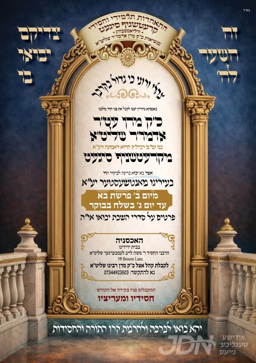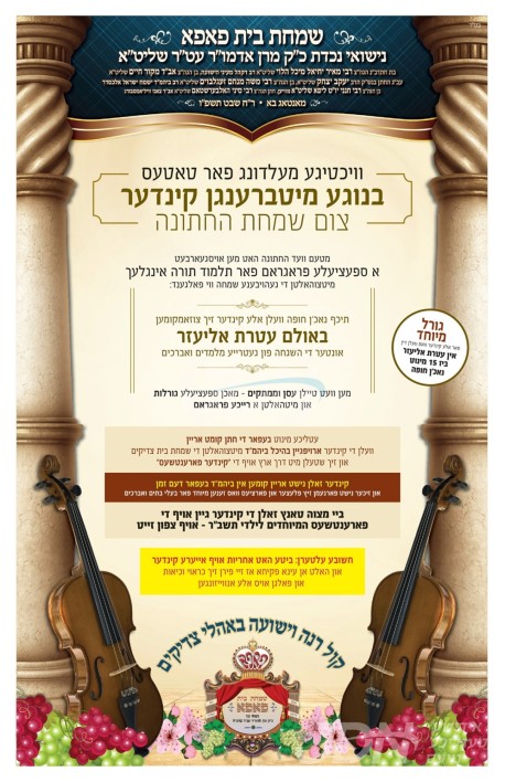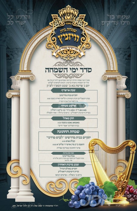 שמחת בית וויזניץ: היינט קומט פאר די סעודת עניים און שמחת החתן מאהל פון א אייניקל ביי כ"ק אדמו"ר מוויזניץ שליט"א פון מאנסי, די חתן א זון פון זיין איידעם הגה"צ ר' נפתלי מרדכי טויב שליט"א אב"ד קאלוב טשעסנאט רידזש, מיט די כלה א טאכטער פון הגה"צ ר' חיים מאיר פיש שליט"א, זון פון כ"ק אדמו"ר מביקסאד שליט"א, און איידעם ביי הגה"צ אבד"ק ראחמיסטריווקא מאנסי שליט"א. – די סעודת עניים קומט פאר היינט פארמיטאג בהיכל ישיבה גדולה אמרי חיים וויזניץ אין נייעק, אינאיינעם מיטן ראש חודש טיש דורכ'ן וויזניצער רבי'ן, און די שמחת החתן מאהל קומט פאר שפעטער ביינאכט אין ביהמ"ד הגדול וויזניץ אין מאנסי.