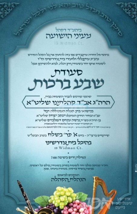 שמחת בית פאפא: היינט קומט פאר די שמחת השבע ברכות פון א אייניקל ביי כ"ק אדמו"ר מפאפא שליט"א, די כלה א טאכטער פון זיין איידעם הגה"צ ר' מאיר יחיאל מיכל דייטש שליט"א אבד"ק מעייני הישועה מאנסי, זון פון הגה"צ ר' יחזקאל דייטש שליט"א אבד"ק מקור חיים, מיט די חתן א זון פון הגה"צ ר' משה מנחם זעגעלבוים שליט"א אבד"ק אלכסנדר וומס"ב, זון פון הגה"צ ר' ליפא זעגעלבוים שליט"א מוויען, און איידעם ביי הגה"צ ר' סיני האלבערשטאם שליט"א אדמו"ר מצאנז וומס"ב. – די שמחת השבע ברכות קומט פאר אין ביהמ"ד מעייני הישועה אין מאנסי.