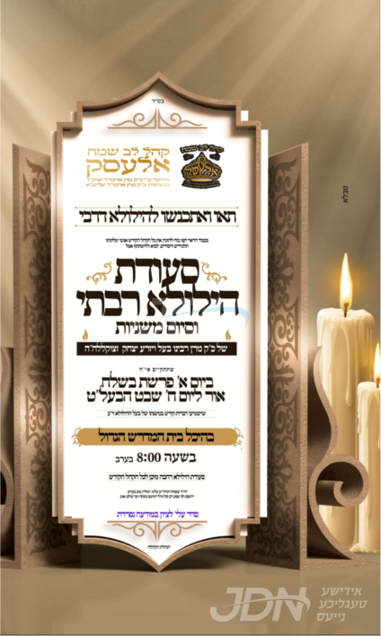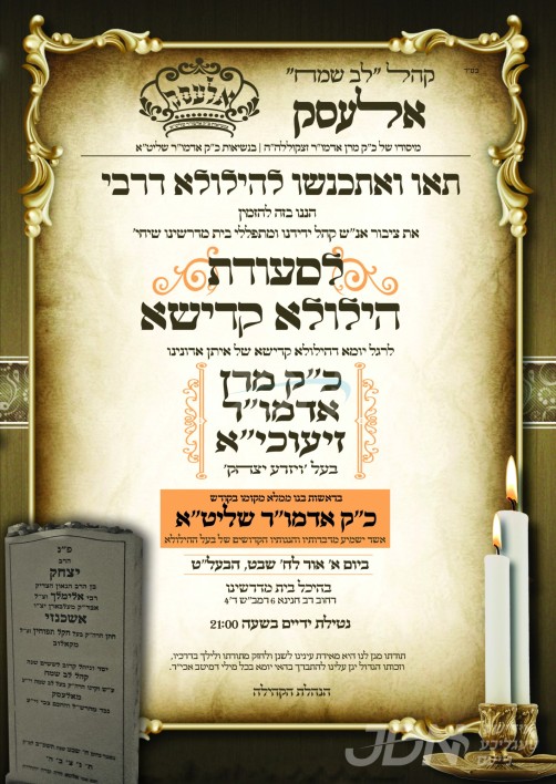 היינט נאכט ח' שבט געפאלט די יומא דהילולא קדישא פון כ"ק אדמו"ר מאלעסק זצ"ל בעל ויזרע יצחק, די צענטראלע סעודת הילולא אין שפיץ פון די קינדער האדמורי"ם והרבנים קומט פאר בבית מדרשו קהל לב שמח אלעסק אין בארא פארק, בנו כ"ק אדמו"ר מאלעסק ארה"ק שליט"א וועט אפרעכטן די יארצייט טיש היינט אויפדערנאכט בבית מדרשו אין די רמה ד' געגנט אין בית שמש.
