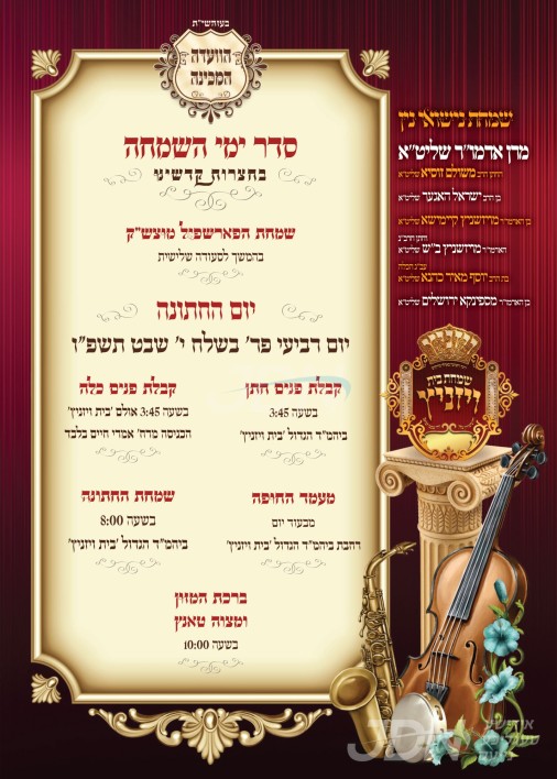 שמחת בית תולדות יהודה סטוטשין: היינט קומט פאר די שמחת השבע ברכות פונעם חתן א זון פון הגה"צ ר' צבי אביגדור יאזעפאוויטש שליט"א, זון פון הגה"צ ר' יוסף ברוך יאזעפאוויטש שליט"א אבד"ק צלותא דשלמה, און איידעם ביי הגה"צ אבד"ק סענדזשארץ שליט"א, מיט די כלה א טאכטער פון הגה"צ ר' ישראל זילה זילבער שליט"א אבד"ק תולדות יהודה סטוטשין אין מאנסי, זון פון כ"ק אדמו"ר מתולדות יהודה סטוטשין שליט"א. – די שמחת השבע ברכות קומט פאר אין ביהמ"ד תולדות יהודה סטוטשין אין מאנסי.