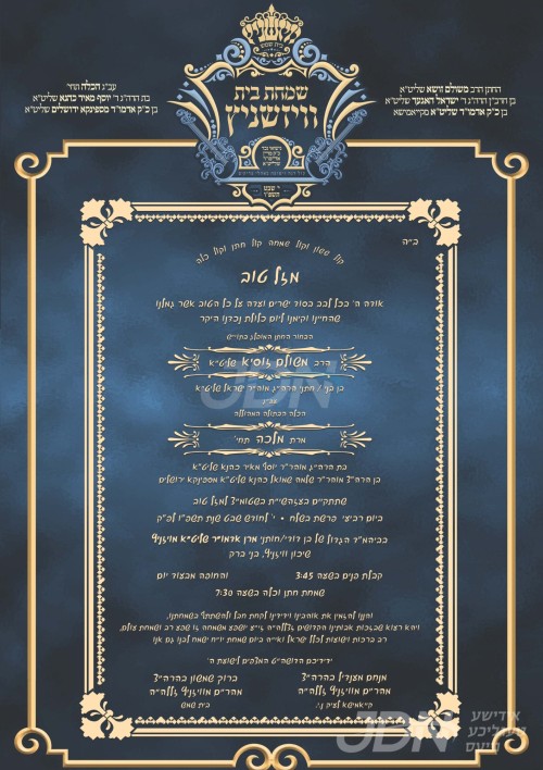 שמחת בית וויזניץ: עס איז געשלאסן געווארן די שידוך פון א אייניקל ביי כ"ק אדמו"ר מוויזניץ שליט"א פון בארא פארק, אור אייניקל פון הגה"צ אבד"ק ראחמיסטריווקא מאנסי שליט"א, די כלה א טאכטער פון זיין איידעם הגה"צ ר' אלימלך טירנויער שליט"א, זון פון כ"ק אדמו"ר מחוסט שליט"א פון וומס"ב, מיט די חתן א זון פון הגה"צ ר' זלמן באב"ד שליט"א, זון פון הגה"צ אבד"ק טארטיקוב שליט"א, און איידעם ביי הגה"צ אבד"ק פאלייענא שליט"א.