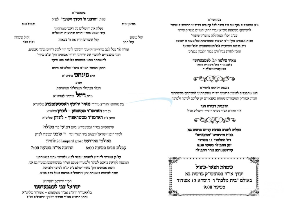 היינט קומט פאר די שמחת החתונה פונעם חתן א זון פון הגה"צ ר' ישראל צבי לעמבערגער שליט"א, זון פון הגה"צ אבד"ק מאקאווא אשדוד שליט"א, און איידעם ביי הגה"צ אבד"ק סערט וויזניץ ירושלים זצ"ל, מיט די כלה א טאכטער פון הגה"צ ר' מאיר יהוסף ראטטענבערג שליט"א, זון פון כ"ק אדמו"ר מקאסאן לאנדאן שליט"א, און איידעם ביי כ"ק אדמו"ר מסטראזניץ לאנדאן שליט"א. – די שמחת החתונה קומט פאר אין זאל פרדס וויזניץ אין לאנדאן.