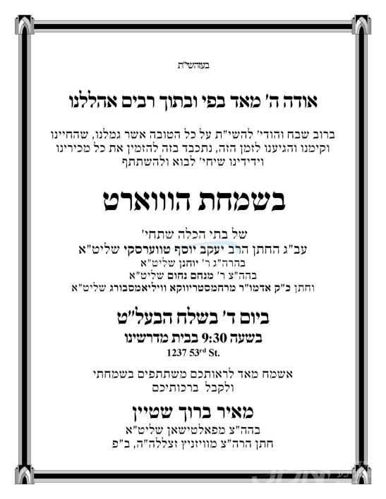 היינט קומט פאר די שמחת החתונה פונעם חתן א זון פון הרה"ג ר' חיים בער שארר שליט"א, זון פון הרה"ג ר' רפאל הלוי שארר שליט"א אבד"ק תפארת גדלי' וראש ישיבת וויזניץ מאנסי, און איידעם ביי הגה"צ אבד"ק ביקאווסק לאנדאן זצ"ל, מיט די כלה א טאכטער פון הרה"ג ר' נפתלי מיללער שליט"א, זון פון הרה"ג ר' דוד מיללער שליט"א אבד"ק תפלה לדוד, און איידעם ביי הגה"צ גאב"ד מאטערסדארף שליט"א, איידעם ביי הגה"צ ר' לייבל סטעמפל שליט"א, אייניקל פון הרה"ק בעל קדושת ציון מבאבוב זי"ע, חתן כלה אייניקלעך פון הגה"ק ממאטערסדארף זצ"ל. – די שמחת החתונה קומט פאר אין זאל נעימת החיים אין לעיקוואד.