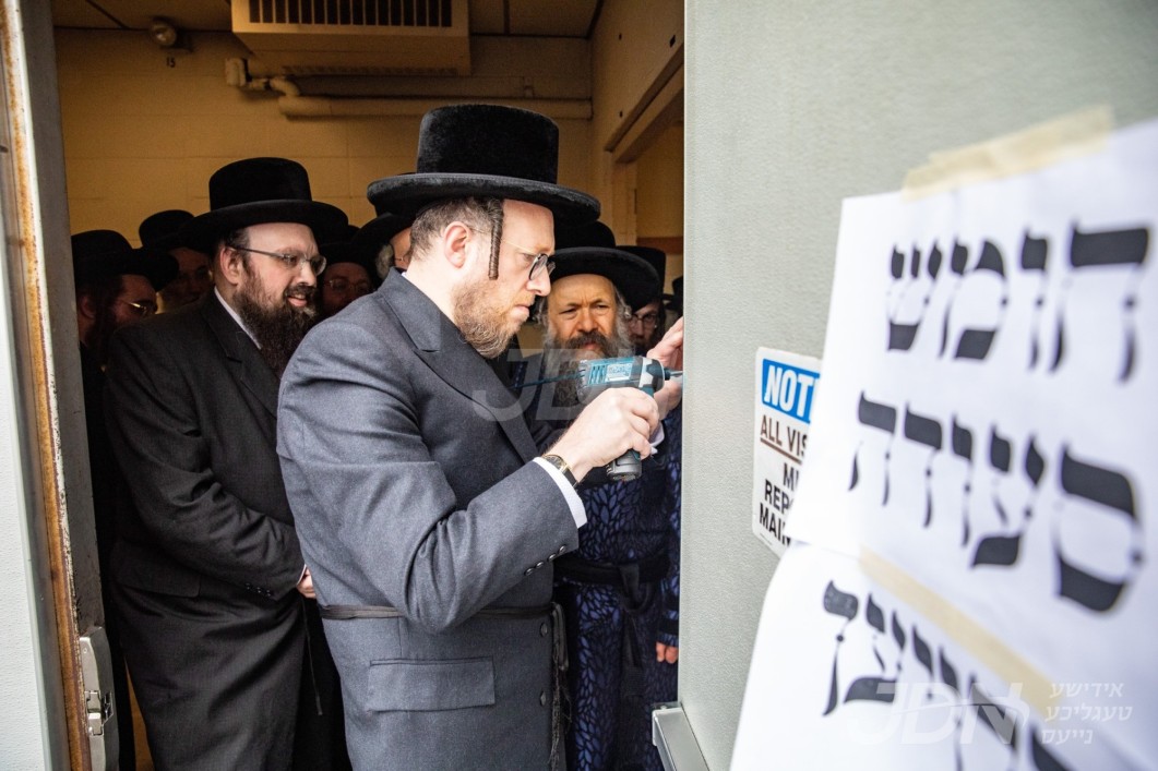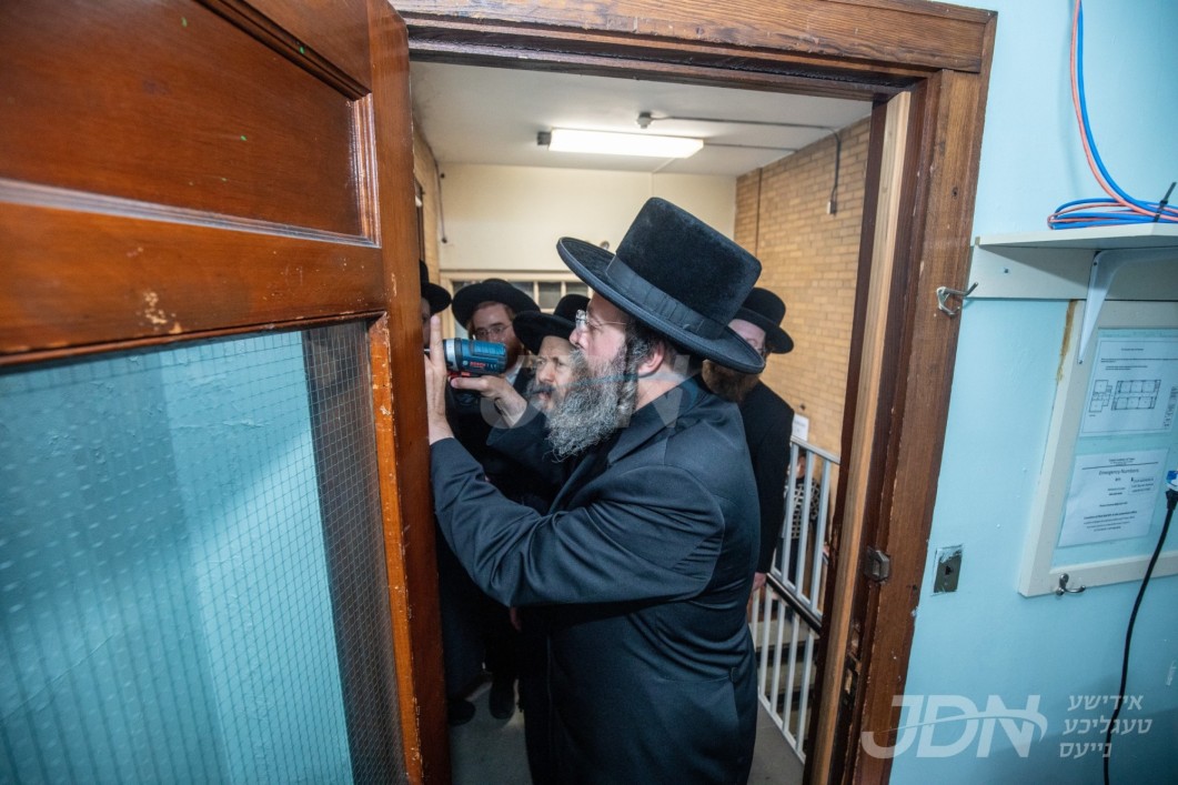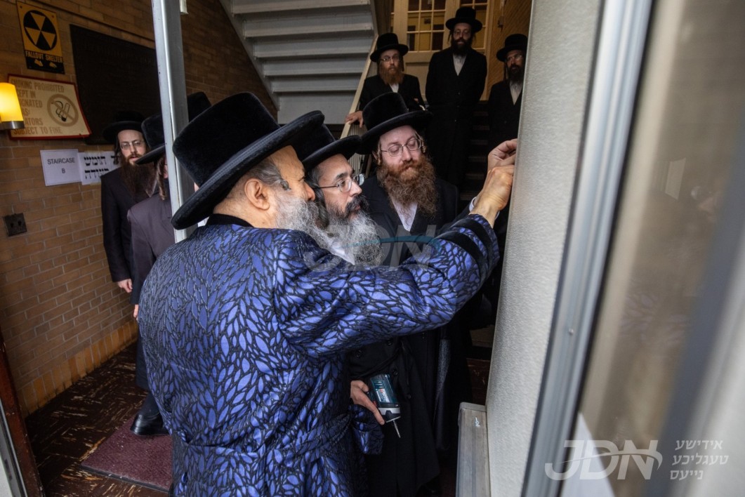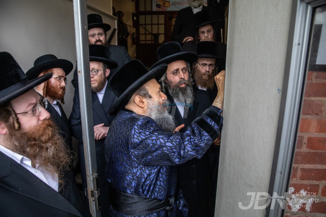 האדמו"ר מבאבוב-45 ביים מעמד קביעת מזוזה אין בנין בית חינוך לבנות און חלוקת פרסים פאר תלמידים פון כתה ז' אין מוסדות באבוב-45 אין יוניאן