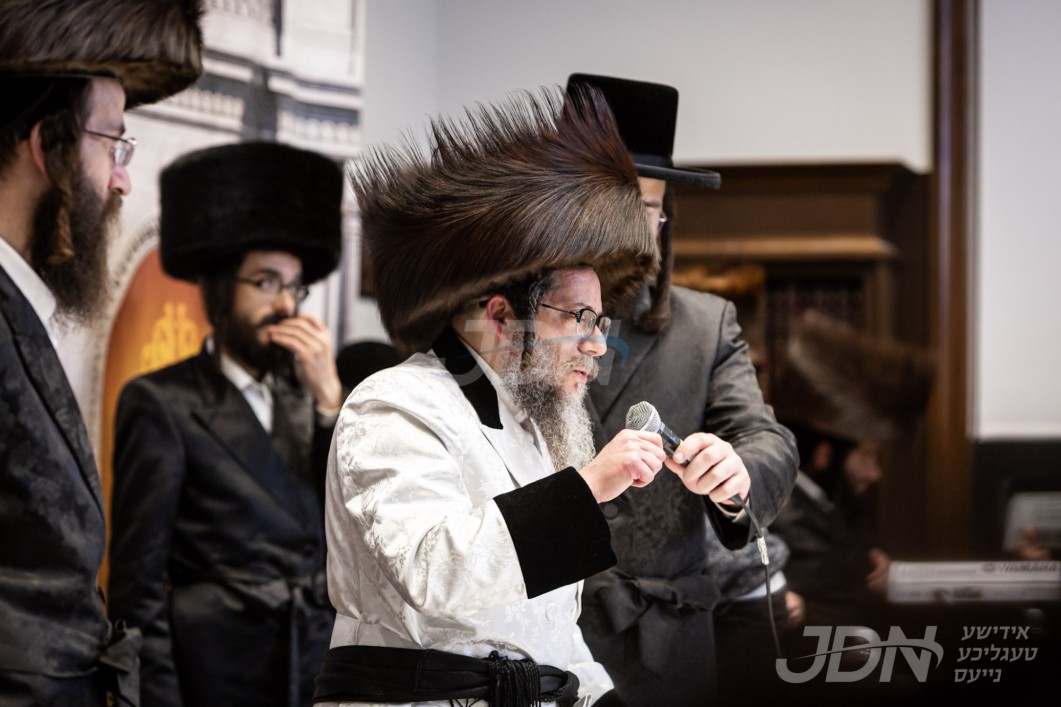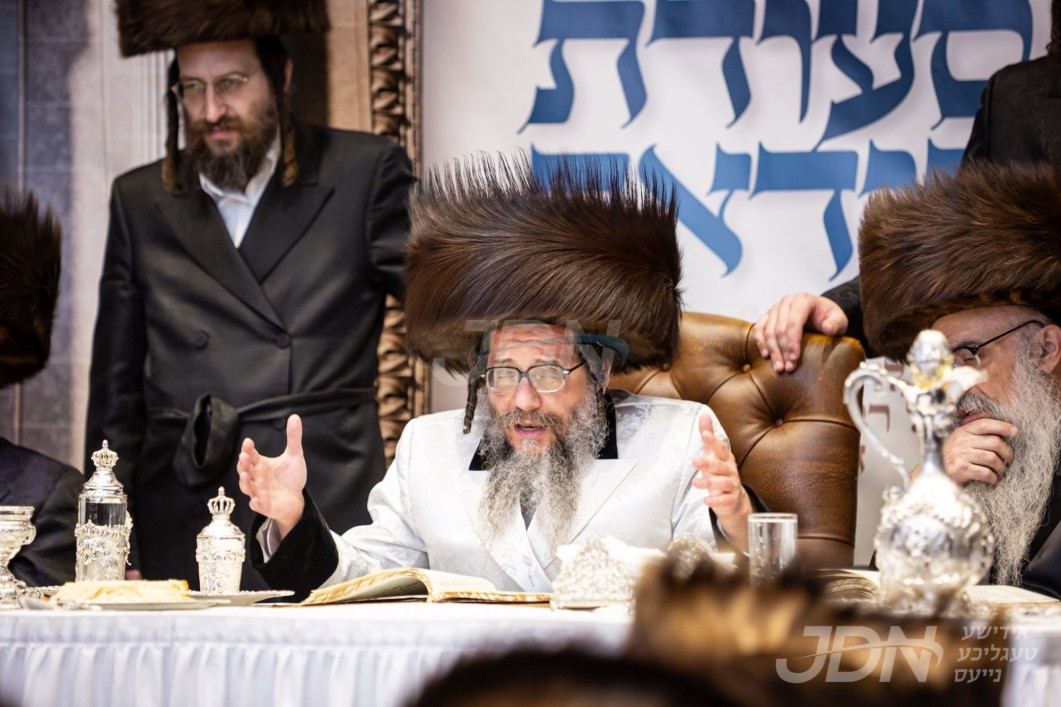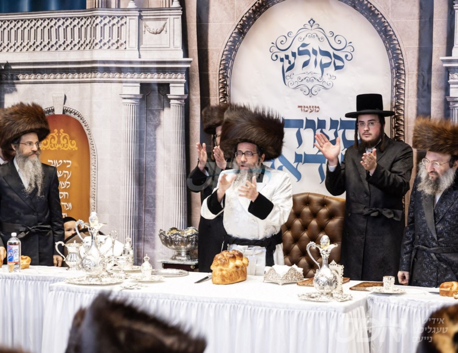 האדמו&quot;ר מסקולען פון וויליאמסבורג ביים סעודת הודאה מוצאי שבת נחמו אין קרית יטב לב בלומינגבורג
