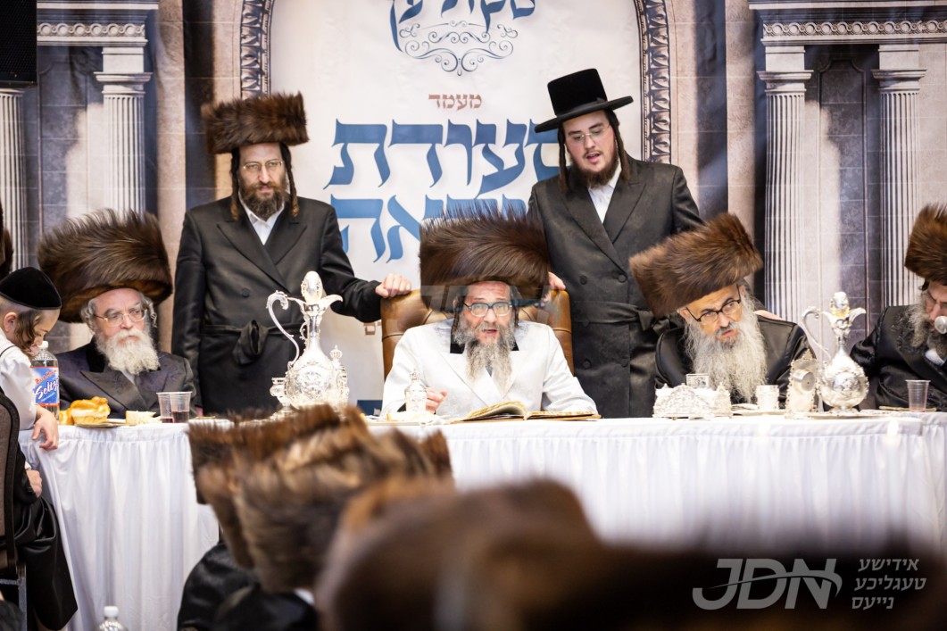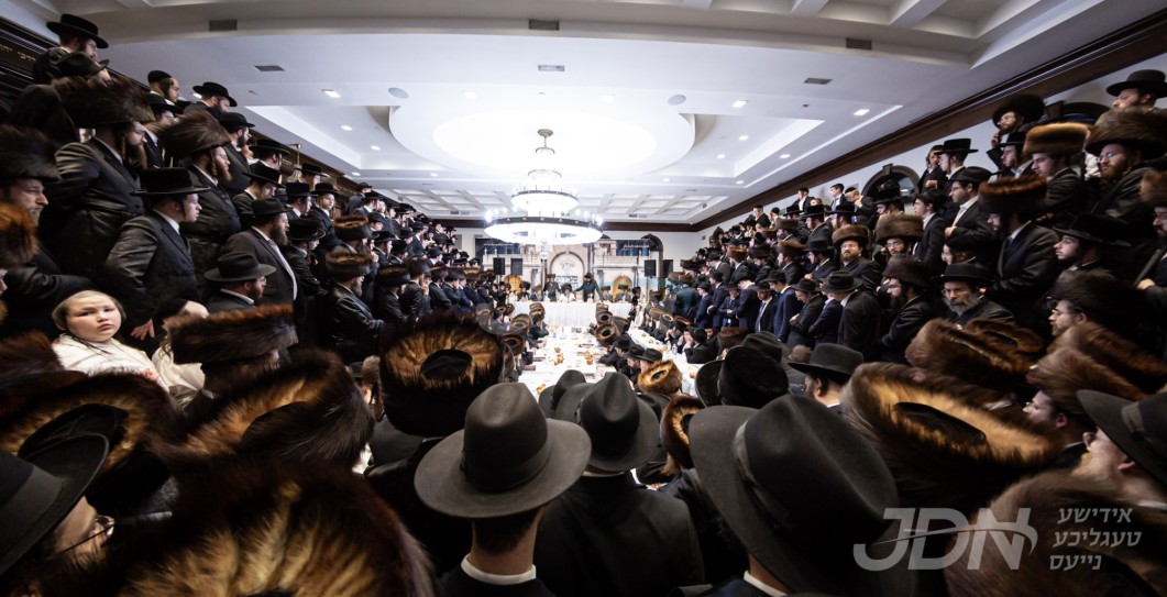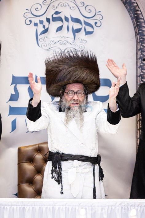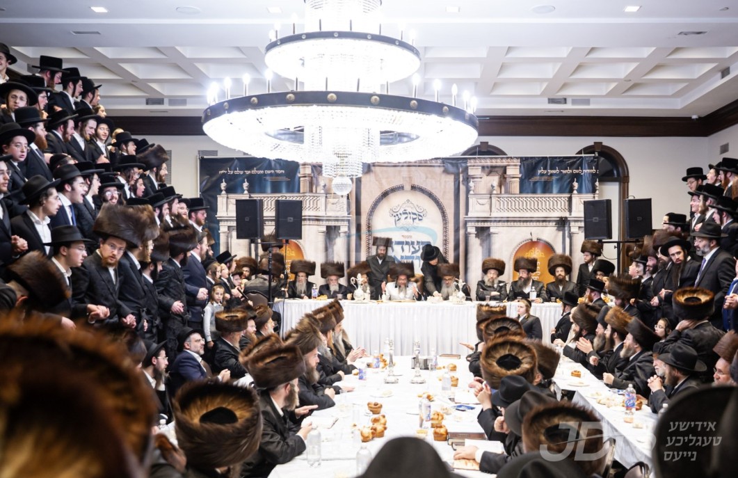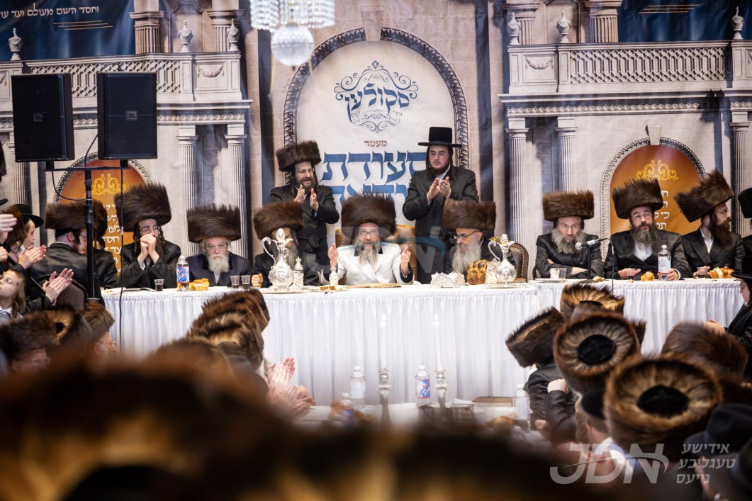 האדמו"ר מסקולען פון וויליאמסבורג ביים סעודת הודאה מוצאי שבת נחמו אין קרית יטב לב בלומינגבורג