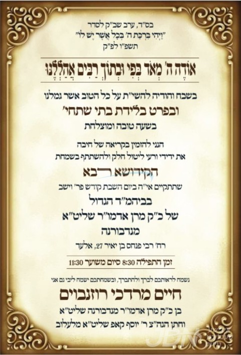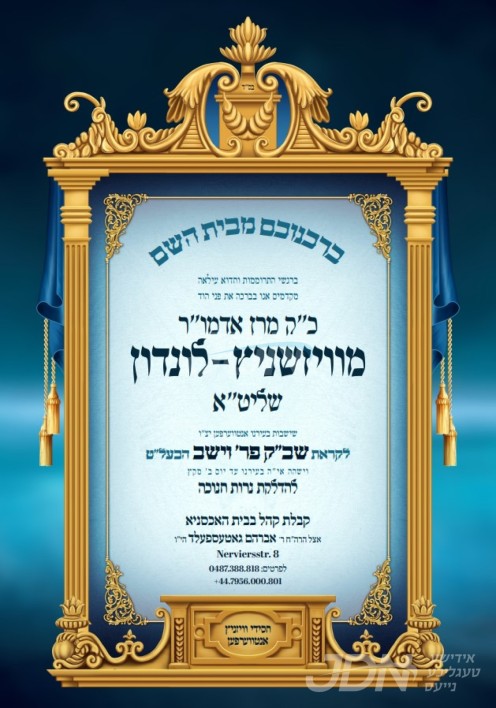 דעם שבת קומט פאר די שמחת הקידושא רבא פון א אייניקל ביי כ"ק אדמו"ר מנדבורנא אלעד שליט"א, איידעם ביי כ"ק אדמו"ר מחוסט שליט"א פון וומס"ב, א טאכטער פון זיין זון הרב חיים מרדכי ראזענבוים שליט"א, איידעם ביי הגה"צ ר' יוסף קאפף שליט"א מלעלוב בראנוביץ. – די שמחה קומט פאר אין נדבורנא ביהמ"ד אין אלעד.